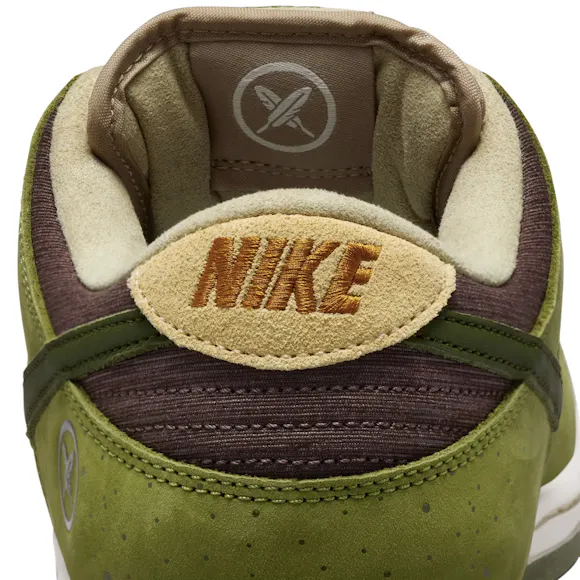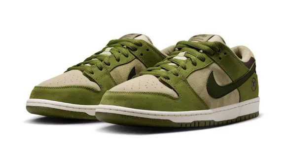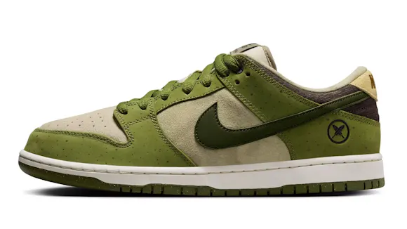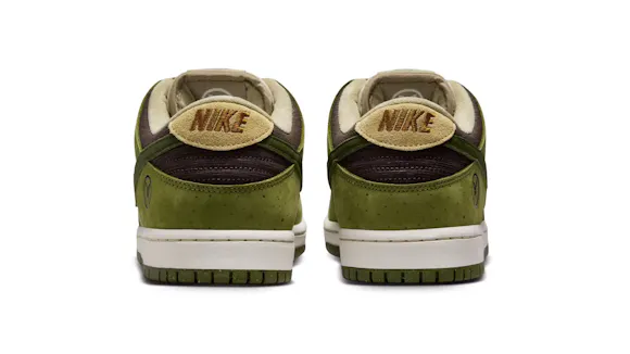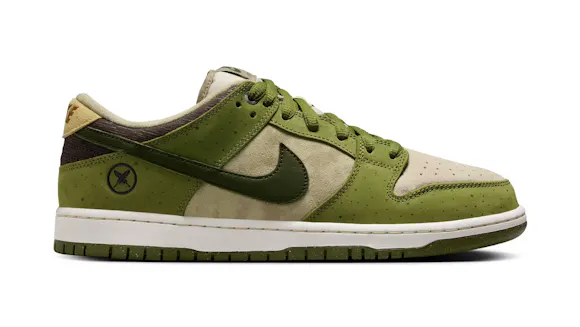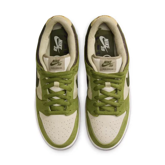 For this edition, the upper balances a mix of Light Khaki suede with Asparagus and Legion Green leather overlays. Slight speckling on the Asparagus panels adds to the shoe's overall earthy aesthetic. Yuto included his family crest on the lateral heel as a nod to his family and Japanese heritage. For the fellow riders in the room, this Dunk Low comes equipped with plush padding and a heel Air Zoom unit for cushioned comfort during hard charges and heavy landings. Lace up and skate like Yuto—or, at least try.