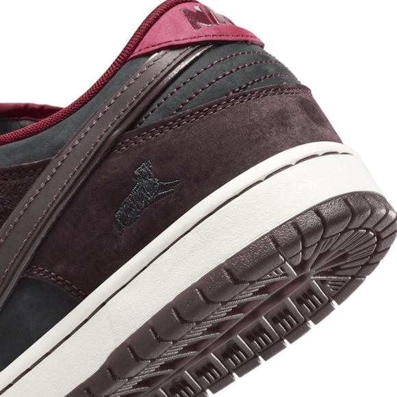 Using a mahogany suede upper with deep tonal reds and black suede underlays, the Riot Dunk Low’s translucent red-toned sole reveals an homage to the grapes that create Bordeaux’s unmistakable flavor profile. The wine theme continues with gradient cork sockliner artwork, waxed seal tongue logos, and debossed heel branding. As a finishing touch, the Riot Dunk Low offers an ode to their departed shop sentinel, with an illustrated embroidered heel logo.