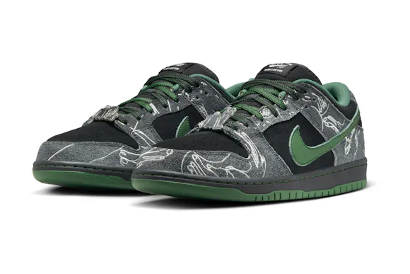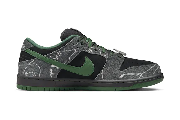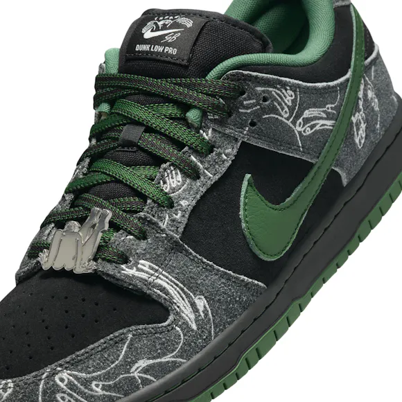Artfully outspoken and fuelled by activism and fun, Jeff Cheung's work with Unity and There defines the true spirit of skateboarding. Cheung's expressive hand style can be seen throughout the design, including co-branding on the tongue and heel, outsole and sockliner art, split-colour laces and engraved dubraes. Using Cheung's "ultra-humanised" artwork as the foundation, it blends two-tone hairy suede with custom embroidered graphics to create a balance between hard and soft. This Dunk Low is a genuine representation of skateboarding's imagination and power.